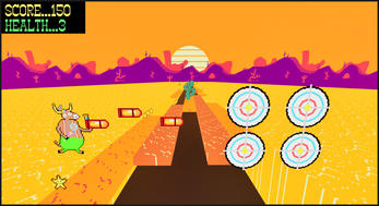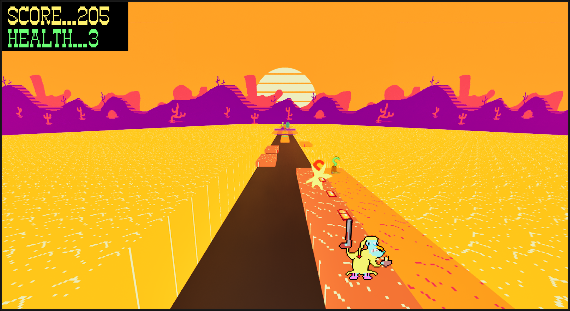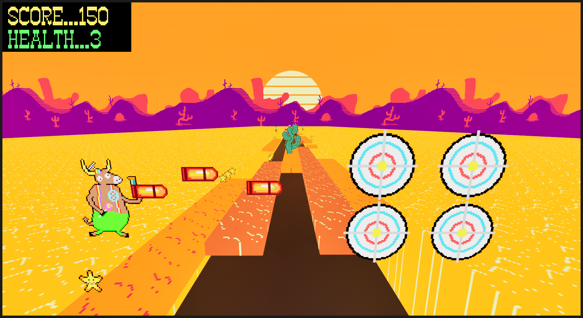 A 3D platform shooter with procedural levels. Traverse the Highway as a grizzled cowboy, blasting foes on all sides! Who can find the fabled Mirage City at the end of the Highway?